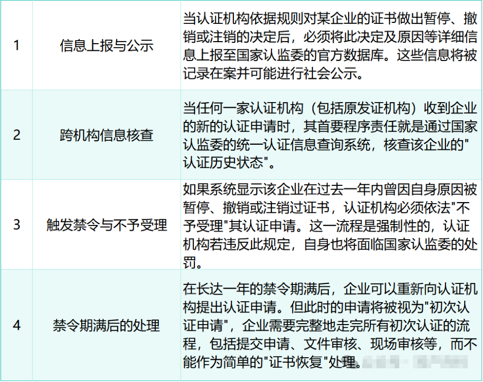 新规中最具威慑力和变革性的条款,无疑是针对因"企业自身原因"导致证书失效后的一年"重新认证禁令"。这一规定直接将证书失效的后果从短期、可控的范围,扩大到长达一年的、全行业范围的禁令,极大地提高了企业维持认证有效性的责任和风险。